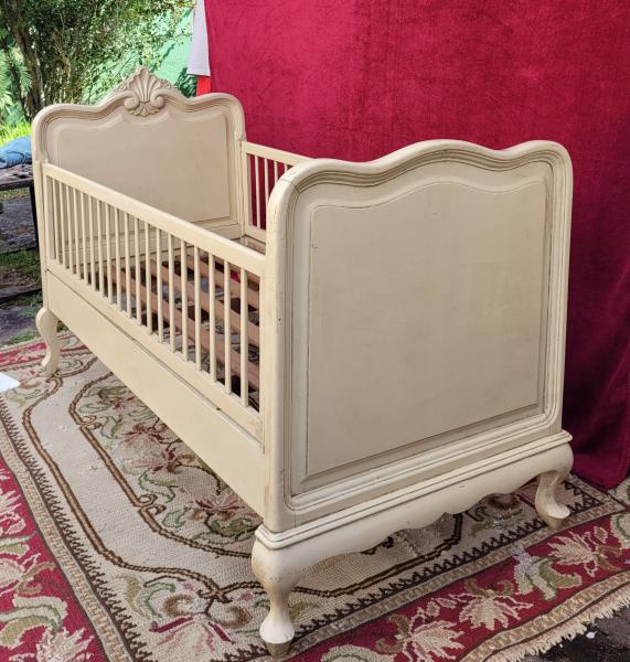 • Berço em madeira nobre maciça patinada estilo Chippendale cerca de 1930/40, cabeceira gradil nas laterais removíveis e reversível para cama. Medidas: 1,02 m x 1,45m x 0,75 cm. faltando apenas um parafuso. Em excelente estado, completo.