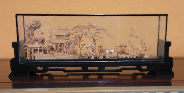• Paisagem oriental com pagodes esculpidos em cortiça, protegido com redoma em acrílico. Med.: 43x16x8cm