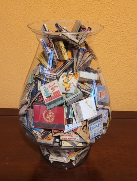• Grande coleção de caixas de fósforos das décadas de 1950 e 1960 constando de 260 unidades. Acompanha o recipiente do mesmo período em vidro, medindo 34x23cm.