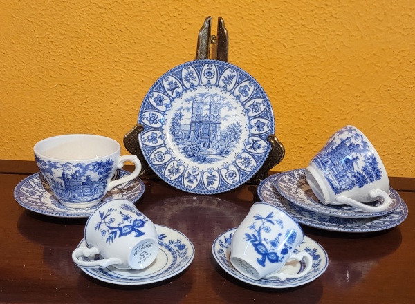• Dois pares de xícaras para chá em café em faiança inglesa decorada com castelo e porcelana  dita "cebolinha". O par para chá acompanha dois pratos de apoio.
