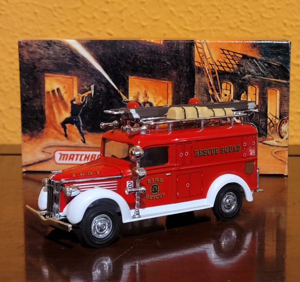 • Matchbox YFE10 1937 GMC Van 'Rescue Squad' 1/43, metal fundido, conservado na embalagem original, perfeito.