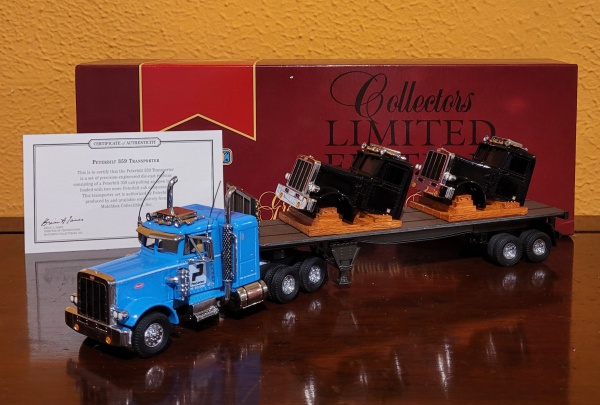 • Matchbox KS192/SA-M 1/58 Peterbilt 359 trator transportador com reboque aberto, metal fundido, conservado na embalagem original, perfeito. 30cm.